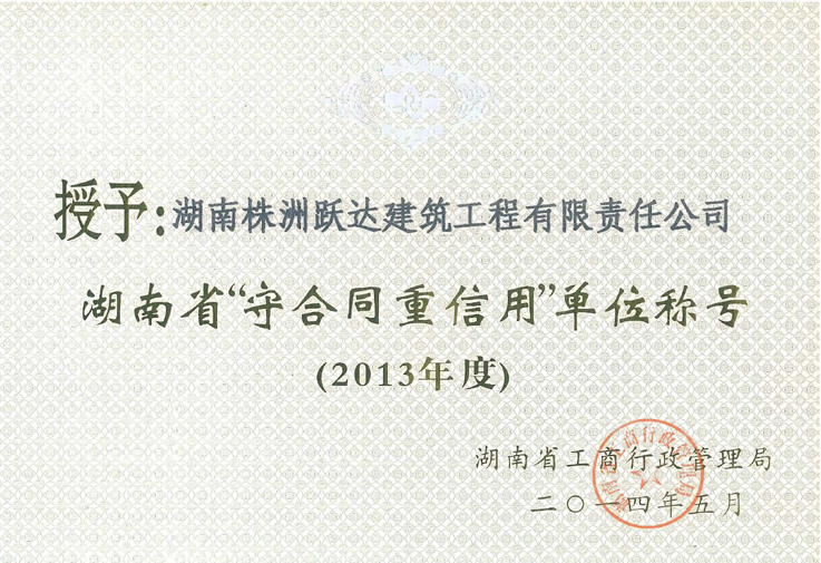 2013年度湖南省"守合同重信用"單位稱號