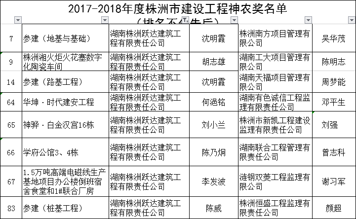 熱烈祝賀我公司承建的株洲湘火炬火花塞數(shù)字化陶瓷車間項(xiàng)目、華坤·時(shí)代建安工程項(xiàng)目、神驊·白金漢宮16棟工程項(xiàng)目、學(xué)府公館3、4棟工程項(xiàng)目、1.5萬(wàn)噸高端電磁線生產(chǎn)基地項(xiàng)目辦公樓倒班宿舍食堂和1#聯(lián)合廠房工程項(xiàng)目,參建的晉合湘水灣一期花園洋房1-22#樓和新增地下車庫(kù)地基與基礎(chǔ)項(xiàng)目、晉合湘水灣三期高層住宅19-23、25號(hào)樓樁基工程項(xiàng)目榮獲2017-2018年度株洲市建設(shè)工程神農(nóng)獎(jiǎng)!